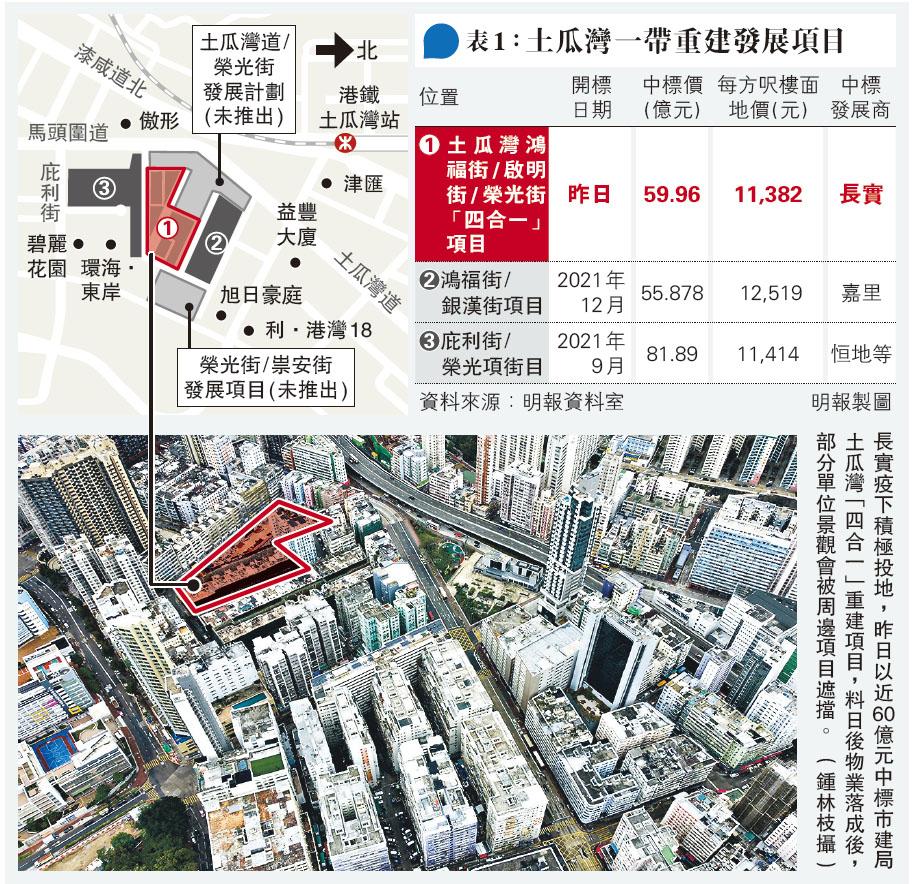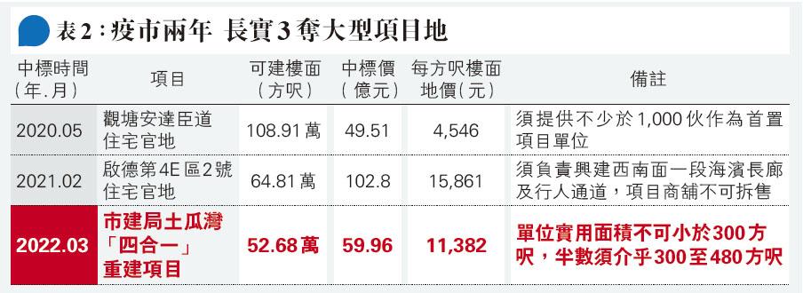 来源:明報 日期:2022-03-04【明報專訊】新冠疫情下,長實(1113)趁低吸納,積極增加土地儲備。長實昨日以59.96億元投得市建局土瓜灣鴻福街、啟明街及榮光街的「四合一」重建項目發展權,以最高樓面52.68萬方呎計,每方呎樓面地價11,382元(見表1),中標價較市場預期下限、每方呎樓面地價1.2萬元低約5%。是次為自2020年本港爆發疫情後,長實第4度中標官地或市建局重建項目,其中3個為大型項目(見表2),金額共涉219.43億元,吸納可建樓面 高達234.25萬方呎土儲。