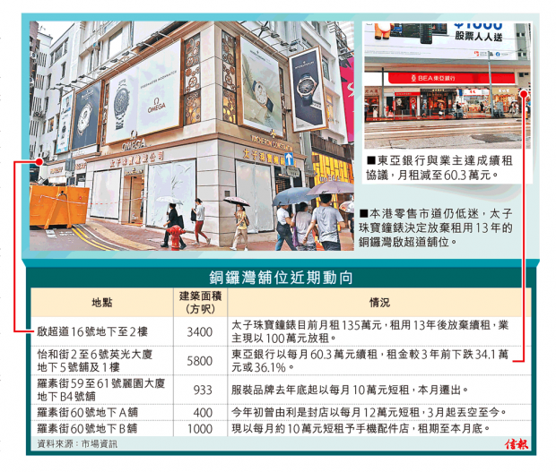 上述舖位為東亞銀行在銅鑼灣的唯一分行,在2015年起以每月80萬元租用,呎租138元,即目前租金較6年前仍要低24.6%。