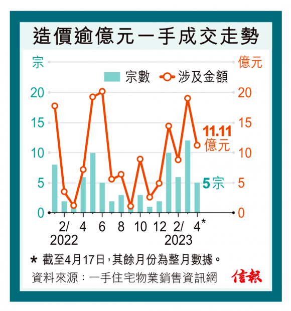 事實上,自內地和本港兩地通關後,新盤豪宅市場明顯回暖,截至4月17日,本月暫錄得5宗逾1億元的新盤買賣。今年初起不足4個月,已錄得33宗造價超過1億元的一手成交,較去年同期只有15宗,按年急增1.2倍,更比去年上半年錄得的32宗還要多1宗;涉及金額約53.08億元,也較去年同期26.63億元,按年增近1倍。