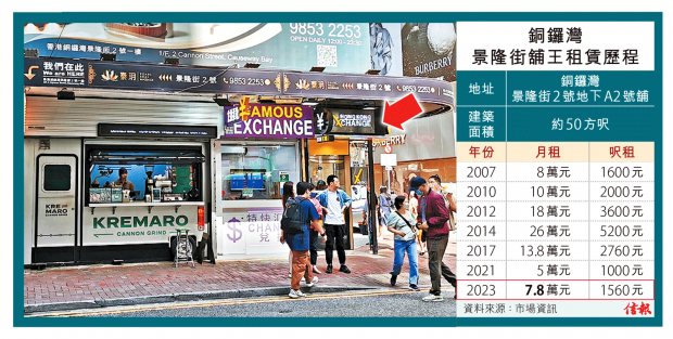 銅鑼灣景隆街50呎舖租7.8萬 找換店貴56%續約兩年 較頂峰平七成