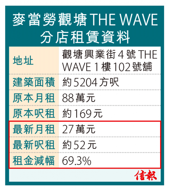 最新續租的THE WAVE舖位的租金減幅由於接近七成,已經取代海富中心的舖位,成為麥當勞近年減租幅度最大的分店。